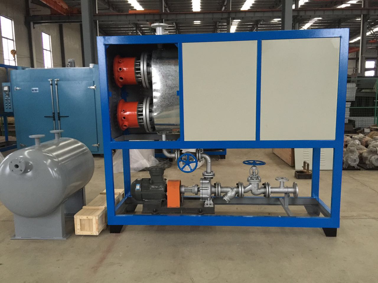 導(dǎo)熱油爐排氣流程: 1、導(dǎo)熱油通過(guò)膨脹槽注油口處加注,并通過(guò)膨脹口管道流入設(shè)備及油爐本體內(nèi),此時(shí)注油時(shí)一定要打開(kāi)系統(tǒng)中所有的閥門(mén)(放油閥除外),讓導(dǎo)熱油流入筒體及需加熱設(shè)備內(nèi)。 2、當(dāng)液面顯示約為膨脹槽高度1/2時(shí),停止注油。 3、首 行常溫排氣:接通電源,打開(kāi)導(dǎo)熱油加熱器的進(jìn)出口閥門(mén)及排氣閥(膨脹管道閥門(mén)需一直開(kāi)著以及時(shí)補(bǔ)充油量),按動(dòng)油泵啟動(dòng)按鈕,油泵運(yùn)行,油泵應(yīng)按箭頭指示方向正常運(yùn)行,壓力表壓力顯示在規(guī)定范圍內(nèi),視聽(tīng)油泵運(yùn)行情況,如有異常現(xiàn)象應(yīng)立即停機(jī)檢查,將故障排除后再重新起動(dòng)油泵,進(jìn)行常溫下排氣,直至壓力表指示穩(wěn)定。進(jìn)行常溫排氣時(shí),要注意觀察膨脹槽內(nèi)的液位,當(dāng)?shù)陀谝?guī)定的液位高度時(shí)要及時(shí)進(jìn)行補(bǔ)充。 4、升溫脫水:在確認(rèn)常溫下運(yùn)行正常后,即可進(jìn)行升溫脫水排氣(操作前詳閱導(dǎo)熱油使用說(shuō)明書(shū)及溫控儀使用說(shuō)明書(shū)),升溫脫水排氣可按如下步驟進(jìn)行: 步:升溫至100-120℃保溫 開(kāi)始升溫時(shí),應(yīng)該控制升溫速度在50℃/h以內(nèi),并且監(jiān)視壓力表顯示是否正常,如發(fā)現(xiàn)無(wú)壓力或壓力不穩(wěn),說(shuō)明系統(tǒng)內(nèi)仍有殘留氣體,此時(shí)要求按3要求重復(fù)進(jìn)行常溫排氣操作,待系統(tǒng)壓力穩(wěn)定后方可繼續(xù),升溫至120℃后進(jìn)行長(zhǎng)時(shí)間保溫,保溫時(shí)間的長(zhǎng)短與系統(tǒng)總?cè)萘考皩?dǎo)熱油的質(zhì)量有關(guān)。  第二步:升溫至150-180℃保溫。  排除油中輕組分、揮發(fā)物及殘余水分,請(qǐng)參照KRD系列導(dǎo)熱油加熱器系統(tǒng)脫水排氣曲線圖操作 第三步:脫水排氣完成后要關(guān)閉排氣閥(其它閥門(mén)無(wú)需關(guān)閉),投入正常升溫運(yùn)行。 5、 升溫脫水排氣過(guò)程有關(guān)事項(xiàng)。 升溫過(guò)程中管路可能會(huì)發(fā)出碰擊的響聲,說(shuō)明系統(tǒng)內(nèi)有大量氣體或管道不暢,此時(shí)要降低升溫速度,待氣體排除便可消除聲響;如系管道不暢所至應(yīng)予以排除。 脫水排氣過(guò)程可能會(huì)有大量氣體涌入膨脹槽,造成槽內(nèi)導(dǎo)熱油外溢,操作前要在溢油管下安置好溢油容器。 進(jìn)行脫水排氣時(shí),現(xiàn)場(chǎng)必須有人員看守,發(fā)現(xiàn)異常及時(shí)處理。   對(duì)于所提的油泵無(wú)油或少許油流出的問(wèn)題,解決方案如下: 1、 關(guān)閉出油口閥門(mén),啟動(dòng)油泵,觀察壓力表顯示情況,若無(wú)壓力,則說(shuō)明回油口無(wú)油補(bǔ)充油泵,使得油泵空轉(zhuǎn),無(wú)后續(xù)油及時(shí)補(bǔ)充,則請(qǐng)貴司檢查一下回油口的供油情況,此時(shí)請(qǐng)確保膨脹槽里有油并膨脹管道閥門(mén)打開(kāi)和需熱設(shè)備有油并出油口閥門(mén)在打開(kāi)狀態(tài)。 2、 如果以上要求都執(zhí)行到位,壓力表還無(wú)壓力,請(qǐng)檢查油爐上的油泵、截止閥及過(guò)濾器是否堵塞。 3、 若壓力表顯示壓力值,而油泵、截止閥及過(guò)濾器并無(wú)堵塞,那油爐的出油口一定會(huì)按油泵所提供的流量進(jìn)行流出。